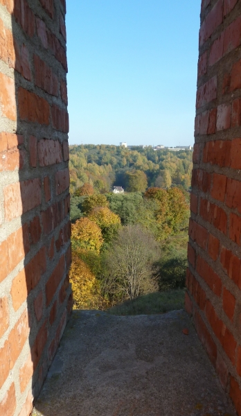 Auf dem Weg zur Stadtmauer treffen wir dem Fotografen I. Chernov, der an einen neuen Projekt arbeitet. Im Vorbeigehen sehen wir im Giebel einer Kirche eine Kanonenkugel aus dem ersten Vaterländischen Krieg stecken. Nach einigem Suchen findet Aleksei den Zugang zur Stadtmauer – er versäumt es aber nicht, uns auf patriotische Hinterlassenschaften hinzuweisen. Ein guter Rat für den Aufstieg über dunkle Treppen ans Sonnenlicht. Wir erleben einen herrlichen Blick auf die Stadt und auf die bunten Herbstbäume auf der anderen Seite der Mauer. Durch eine Schießscharte gelangen wir auf die stadtauswärts gewandte Seite der Mauer und gehen auf einem Trampelpfade zurück zum Nikolaustor.
