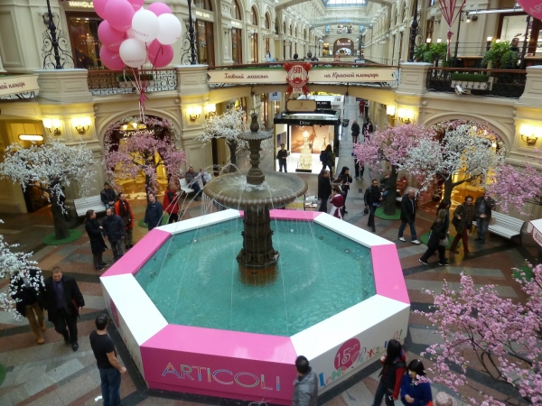 Leider sprudelt kein Wasser mehr in den Märchenbrunnen. Und auch das Bolchoi-Theater ist wegen eigenartigen Bauten nicht gut zu sehen. So schauen wir uns das „GUM“ – Eis essen, Kleinigkeiten kaufen und die interessanten Geschäfte ansehen.