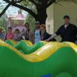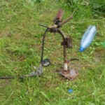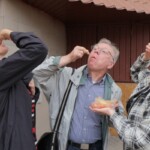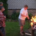 Alle reden, essen trinken und jeder verbreitet gute Stimmung – nur Alexander ist für einige Augenblicke verschwunden. Doch da ist er schon wieder und hat eine eigenartige selbst gebaute Maschine in der Hand. Wie sich bald herausstellt ist es eine Plastikflaschen-Schießanlage. Alexander sammelt die 1-Liter Plastikflaschen ein, füllt sie halb mit Wasser und gibt über das Maschinchen Pressluft hinzu. Danach löst er die Sperre, die die Flasche hält. Mit eine großen Knall fliegt das Geschoss durch den Garten und versprüht das Wasser. Bernd, der den Vorgang fotografieren wollte, erschrak so sehr, dass er umfiel und rückwärts über die Wiese kugelte. Na, dieses Spielzeug ist eines Düsentriebs würdig und jetzt wurde geschossen, bis die letzte Flasche zerborsten war. Vielleicht sollte man Streitigkeit mit diesen lustigen Wasserbomben austragen. Aus lauter Freude am Spiel würden sich die nassen Gesellen sicher mit geistigen Getränken verbrüdern. Wir mussten das nicht, denn wir hatten auch so einen Heidenspaß!