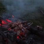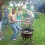 Langsam füllt sich der Tisch. Doch es ist auch Zeit für einen Gang durch den Garten und gute Gespräche. Aleksei und Sascha braten das Fleisch und trinken mit Bernd und Aleksander einen kleinen Wodka, während Aleksander gleichzeitig den alten Samovar für das heiße Teewasser vorheizt.