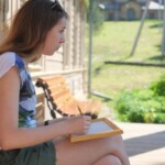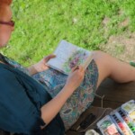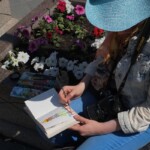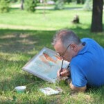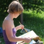 Der bekannte russische Maler und Illustrator des Design-Büros von Artemi Lebedev gestaltet für unsere Preisträger eine Masterclass. Die wunderschönen Motive sind unmittelbar ins Auge gefasst und nach dem Verteilen der Materialen geht es sofort an die Arbeit. In der Hitze ist an arbeiten ohne Kopfbedeckung überhaupt nicht zu denken. So suchen sich die meisten einen schattigen Standort aus. Monika und Sandra zeichnen Skizzen. Es entstehen durchaus sehenswerte Werke, aber selbstverständlich kann niemand dem großen Meister das Wasser reichen. Denis hat noch demonstriert, wie er Portraits malt – das war in der Tat beeindruckend. Die Protraitierten durften die Bilder behalten.