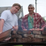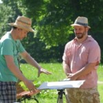 Doch mit ihrer Arbeit beschäftigen wir uns später, denn es muss das Picknick im Garten vorbereitet werden. Sascha Dolossov und Aleksei kümmern sich um das Schaschlik und einige andere bereiten die große Tafel im Garten vor.