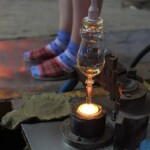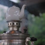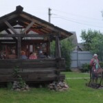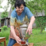 Der Tisch in dem Gartenpavillon füllt sich nach und nach. Obwohl es schon sehr kühl ist, haben die meisten großen Durst und nach einem Begrüßungsbierchen, gehen die meisten dazu über, Wasser zu trinken. Sascha breitet einen alten, sehr großen Samovar für den Tee vor. Das Entzünden des Holzes ist nicht einfach, doch nach einiger Zeit ist es geschafft. Die Teekanne mit dem starken schwarzen Tee steht oben auf dem Samovar. Nachdem wir von diesem Tee kosten durften, wollte jeder nur noch den Tee trinken. Wir erlebten russische Gastfreundschaft pur.