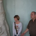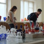 Anatoli erläutert uns an jeder Station, um welchen Arbeitsschritt es sich handelt, Nach den Schleifvorgängen folgt eine chemische Behandlung des Glases, damit es klar wird. Wir verlassen das Gebäude und klettern in einem anderen Haus bis in das dritte Stockwerk, um in das Glasmuseum zu gelangen. Man kommt aus dem Staunen nicht heraus, was die Menschen hier noch vor Kurzem geleistet haben. Bis vor Kurzem: Weil es keine Facharbeiter oder Facharbeiterinnen mehr gibt, die farbiges Glas gestalten können. Das ist sehr bedauernswert, denn die Erzeugnisse halten jedem Vergleich mit Böhmischem Glas stand. Früher gab es im Smolensker Gebiet zahlreiche Glaswerke, heute nur noch dieses. Hierhin sollte man Subventionen geben, damit diese Industrie und dieses edle Handwerk wieder an Ansehen gewinnt und für Smolensk würde das neue Arbeitsplätze bedeuten. Verena und Bernd liebäugeln mit dem Kauf einer Vase, aber das ist bekanntlich in Museen nicht möglich, auch nicht aus den Magazinbeständen.