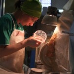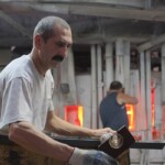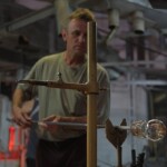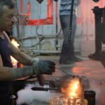 Jetzt sind die Glasbläser an der Arbeit. Auf der Bühne herrscht nun ein geordnetes Gewusel. Fünf Menschen sind hier auf der Bühne an dem Herstellungsprozess eines kleinen Weinglases beteiligt. Davon ist nur einer ein Glasbläser, die anderen vier arbeiten ihm in einem genau getakteten Rhythmus zu – die Harmonie ist genial. Aber auch anstrengend, weil sie in diesem Takt ca. zwei Stunden arbeiten.