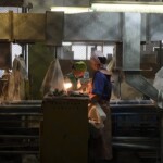In der Halle befindet sich kein Glasbläser auf der Arbeitsbühne. Nur an einer Station wir Pressglas hergestellt, Wir sind zu früh gekommen, denn die nächste Schicht beginnt erst in einer Stunde. Kein Problem, denn an der nächsten Fertigungsstelle arbeiten mehr als zehn Frauen, die Muster in die Gläser schleifen. Die Frauen arbeiten rasant schnell und es ist nicht leicht ein Foto ohne Unschärfe zu schießen, doch einige sind sehr gelungen und vermitteln eine Vorstellung von den Leistungen dieser Kunsthandwerkerinnen.