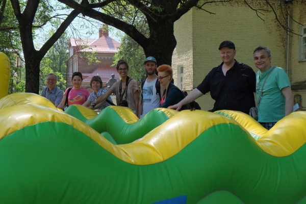 Die Hitze ist schon deutlich spürbar. Und heute ist ein anstrengender Tag mit dem Aufbau der Ausstellung. Künstler und Preisträger schaffen ihre Bilder in das Kulturzentrum. Steffen ist etwas spät dran, aber das ist kein Problem. Sascha Dolosov und Aleksei Dovgan sind ein tolles Team und gehen ruhig, aber sehr zielstrebig an die Arbeit. Weil sie diese Arbeit lieber allein machen, dürfen die anderen in die Stadt gehen.