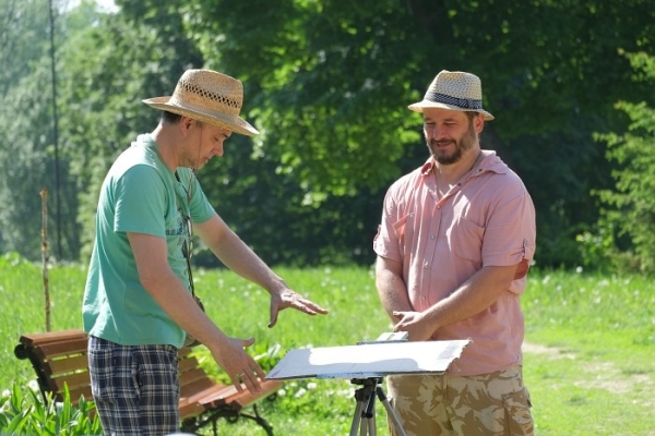 Der bekannte russische Maler und Illustrator des Design-Büros von Artemi Lebedev gestaltet für unsere Preisträger eine Masterclass. Die wunderschönen Motive sind unmittelbar ins Auge gefasst und nach dem Verteilen der Materialen geht es sofort an die Arbeit. In der Hitze ist an arbeiten ohne Kopfbedeckung überhaupt nicht zu denken. So suchen sich die meisten einen schattigen Standort aus. Monika und Sandra zeichnen Skizzen. Es entstehen durchaus sehenswerte Werke, aber selbstverständlich kann niemand dem großen Meister das Wasser reichen. Denis hat noch demonstriert, wie er Portraits malt – das war in der Tat beeindruckend. Die Protraitierten durften die Bilder behalten.