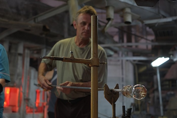 Jetzt sind die Glasbläser an der Arbeit. Auf der Bühne herrscht nun ein geordnetes Gewusel. Fünf Menschen sind hier auf der Bühne an dem Herstellungsprozess eines kleinen Weinglases beteiligt. Davon ist nur einer ein Glasbläser, die anderen vier arbeiten ihm in einem genau getakteten Rhythmus zu – die Harmonie ist genial. Aber auch anstrengend, weil sie in diesem Takt ca. zwei Stunden arbeiten.