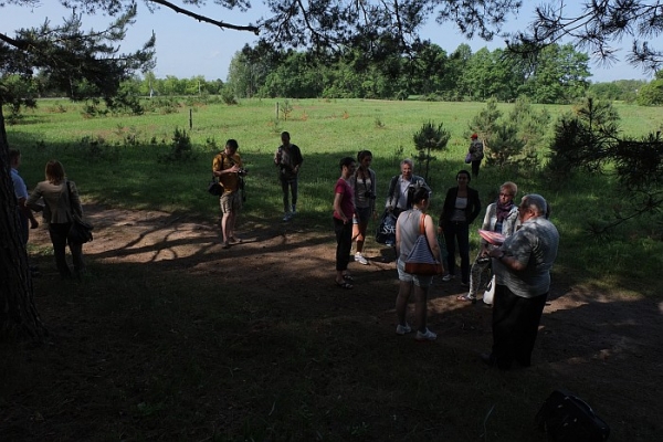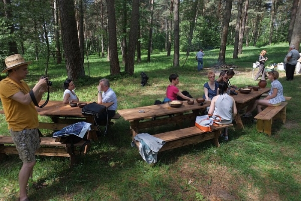 Über die Eisenbahntrasse Brest-Moskau kommen wir zu einem sehr schönen kleinen See. In einem großen Bogen wandern wir durch den kühlen Wald und erreichen schließlich einen Platz an dem ein Picknick für uns bereitet wird: Mittelalterliche Speisen (Buchweizen mit Schweinefleisch) wird über offenem Feuer gegart. Salate und ein Honigbier sowie Kräutertee stehen zum Verzehr bereit. Alles ist köstlich und der Direktor des Museums und seine Mitarbeiter informieren uns weiter über diesen Ort und die gefunden Gegenstände, die auch als Schmuckstücke angeboten werden. Da können die Damen. nicht widerstehen. Die Studierenden zeichnen Skizzen und wir schauen uns die Pflanzen an. Es ist eine sehr intakte Natur. Der Eine oder Andere gestattet sich ein Nickerchen.