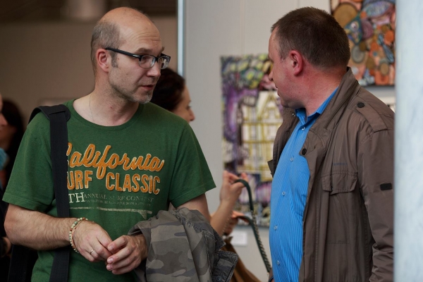 Der große Ausstellungsraum ist gut gefüllt. Viele Mitglieder und Freunde unserer Vereine, aber auch Kunstinteressierte, sowie zahlreiche Künstler: u.a. auch Igor Chernov, der renommierte Fotograf, weiter Fotografen wie Sergej Korobeshko, das Smolensker Gitarrenensemble, das uns spontan zu einem Konzert einlädt, viele bildende Künstler, zwei Fernsehsender, auch Vertreter der schreibenden Zunft. Auch einige ehemalige Preisträger sind erschienen.
