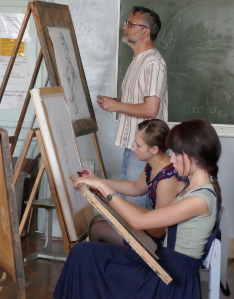 In der Staatlichen Universität warten Künstler (u.a. Professor A. Parfeonov, der Dozent Khramov, Aleksej Dovgan ……) Studierende und ein Aktmodell auf uns. Aktzeichnen steht auf dem Programm. Wieder hat der Kunstdozent Pjatkov diesen interessanten Programmpunkt für unsere Preisträger gestaltet. In zwei Sitzungen von je 45 Minuten kann das Modell in unterschiedlichen Posen und aus verschiedenen Perspektiven gezeichnet werden. Es wird nur wenig geredet, doch es wird uns erlaubt, auch zu fotografieren.