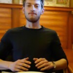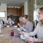 Der Koch Jenja Puchkov hat für jeden einen Ring aus Hefe gebacken, dessen Mitte mit schmackhaftem Käse gefüllt ist. In die Mulde, in der der Käse ist, hat er ein Spiegelei geschlagen, das erst durch den heißen Teig stockt. Wir müssen kleine Stücke vom Teig abrechen, in das Ei tunken und essen. Besteck wird dabei nicht benötigt – nur saubere Hände. In der Kombination mit frischem Gemüse und Gewürzen entwickelt sich ein Gaumenschmaus der besonderen Art. Die Zusammensetzung der Speisen ist so einfach wie stimmig – die Tischrunde mampft, was das Zeug hält und es entwickeln sich gute Gespräche. Einzelne schaffen es nicht, alles aufzuessen.