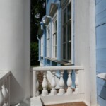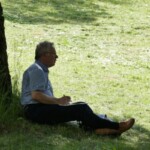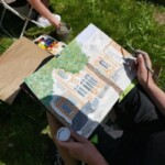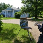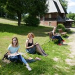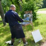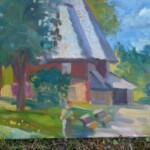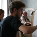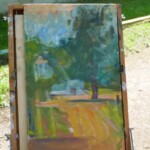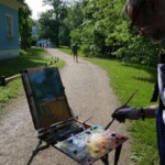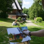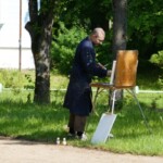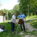 Bald ist das Gewitter abgezogen. Die Sonne brennt wieder vom Himmel und ich verziehe mich in den Schatten auf der Terrasse und schreibe meine Bilder. Die anderen „schreiben“ irgendwo die ihren. Als die Hitze zu groß wird, entdecke ich Aleksej Dovgan und Alexander Dolossov in der Nähe des Herrenhauses. Alexander „schreibt“ ein Bild vom Herrenhaus, er ist konzentriert, bewegt sich zur Leinwand und nimmt wieder Abstand, um sein Bild korrekt zu schreiben, eben wie es Meister tun!