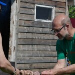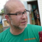 Später fahren wir zum Atelier von Aleksej Dovgan, um das Programm des Projekts zu besprechen. Wie immer hat Aleksej Köstlichkeiten aufgefahren, er gestattet allen sich ungeniert umzuschauen. Zu unserer Freude erscheinen, wie aus dem Nichts, die beiden Preisträger von „Junge2Kunst“ Alexander Savchenko und Alexander Ryghorchuk. Die jungen Menschen sind sehr schnell miteinander „warm“ und es kommt wie es kommen muss, Alexander Savchenko lädt, wie vor zwei Jahren zum Grillen in sein Elternhaus ein.