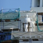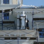 Der kleine Park am Platz des Sieges lädt zum Verweilen ein, denn im Schatten der Bäumen ist es angenehm kühl. Das Gebäude des ehemaligen Hotels, in dem künftig das Smolensker Gericht unterkommen wird, steht vor der Vollendung. Die restaurierten Skulpturen befinden sich wieder hoch oben auf ihren angestammten Sockeln und blicken über den Platz.
