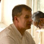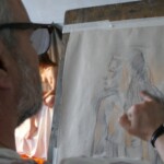 Gegen 17 Uhr treffen wir uns, es ist schon gute Tradition des Wettbewerbs bei einem der renommiertesten Künstler von Smolensk in dessen Atelier: Alexander Dolossov. Wir diskutieren über seine Bilder, besonders über ein Aktbild, dass er schon 2001 in Hagen ausgestellt hat und erfahren die Hintergründe, wie dieses Bild entstanden ist, doch diese Informationen bleiben, wie es sich gehört bei uns. Der Künstler berichtet von seiner Reise nach Indien und seinen Erfahrungen, die er dort gemacht hat. Alles ist sehr interessant für die jungen bildenden Künstler und Leopold findet immer neue Motive.