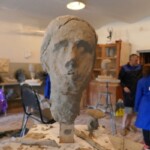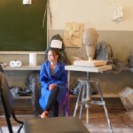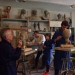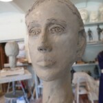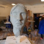Wir erleben zunächst eine intensive Einführung in die Arbeit, die vor uns liegt – wichtig ist, das Plastiziermaterial um einen Holzstumpf zu pressen und es dann synchron mit beiden Händen nach vorgegebenen Kriterien der Kopfform des Modells anzupassen. Unser Modell ist eine junge Studentin – alle fünf Minuten wird sie auf dem Podest ein Stück weiter gedreht, so dass wir sie von allen Seiten betrachten können.