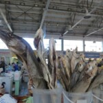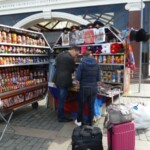 Tausende Gerüche strömen in der alten Markthalle in unsere Nasen. Den Anblick der vielfältigen breiten Angebote muss man erst einmal erfassen. So viele interessante Waren werden nicht einmal in der neuen Rotterdamer Markthalle angeboten. Zunächst kauft Alex lang vermisste russische Süßigkeiten. Mir fallen unerwartet Beutelweise koreanische Leckereien in die Hände – damit steht fest, dass wir am Abend zu Aleksej Dovgan zum Essen in sein Atelier gehen müssen. Draußen an unübersehbar vielen Ständen wird das interessante Angebot in seiner Vielfalt abgerundet. Von einem Mangel durch europäische Sanktionen ist nichts zu erkennen. Die Angebote scheinen noch größer zu sein als vor einem Jahr – aus eigener Produktion aus Südamerika und aus Asien. Die russischen Händler besonders die Händlerinnen sind sehr geschickt, Engpässe zu kompensieren.