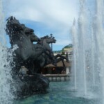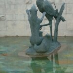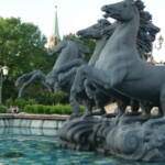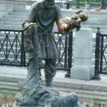 Zahlreiche Nachtschwärmer begegnen uns im Park unterhalb des Kremls. Aber keiner scheint betrunken zu sein, die Menschen gehen spazieren, sitzen auf Bänken und reden miteinander – es ist 5 Uhr. Langsam schlendern wir durch den Park an den Märchenskulpturen im Brunnen vorbei Richtung „Roter Platz“. Bei dem Gasthaus mit dem großen „M“, wo es „fast Essen“ gibt, drängen sich junge Leute, um den Fetthaushalt aufzufüllen. Der Müll vor diesen „Gourmet“-Restaurants ist überall auf der Welt gleich. Dagegen kommen selbst Moskaus Fegekolonnen nicht an.